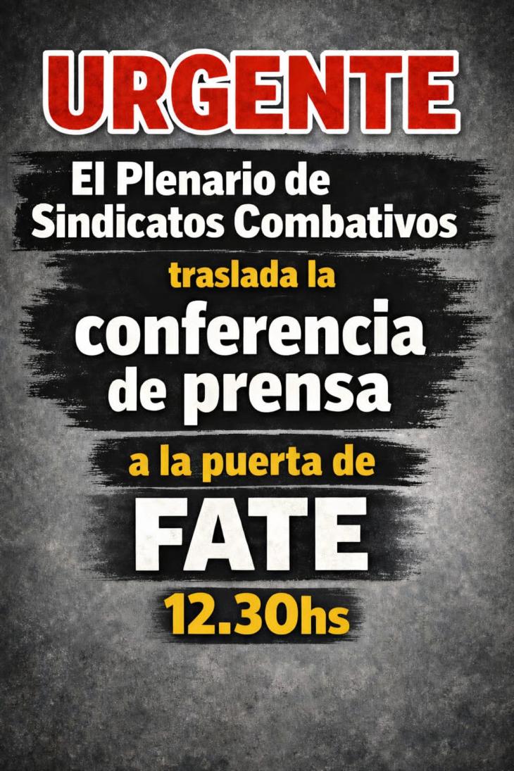 Luego del incidente registrado en FATE, el Plenario de Sindicalismo Combativo anunció que a las 12:30 horas recibirá a los periodistas en la puerta de la fábrica, donde aprovecharán para dar a conocer la posición de los trabajadores.