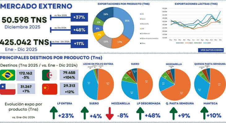 La evolución por producto en toneladas mostró comportamientos diferenciados. La leche en polvo entera registró un crecimiento interanual del 23% en el acumulado enero-diciembre de 2025 y el suero aumentó 4% en el mismo período. En tanto, la mozzarella presentó una baja del 8%, mientras que los quesos de pasta semidura crecieron 48%. La leche en polvo descremada y la manteca mostraron subas del 11%.