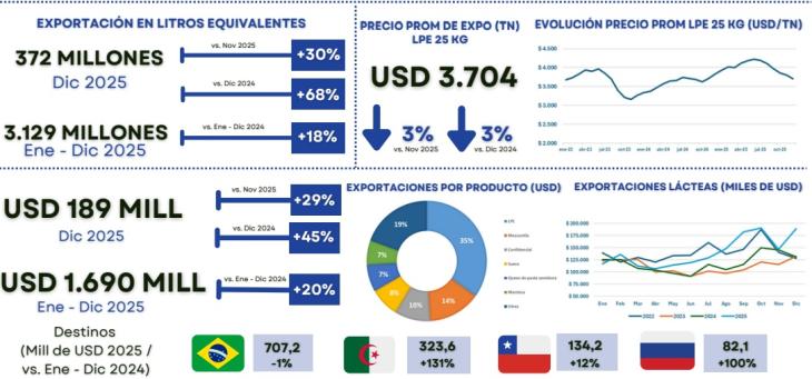 En cuanto a los productos, la leche en polvo entera mantuvo un rol central dentro del esquema exportador. El precio promedio de exportación de la leche en polvo entera en presentaciones de 25 kilos se ubicó en USD 3.704 por tonelada en diciembre de 2025. Ese valor implicó una suba del 3% frente a noviembre de 2025 y un aumento del 45% en comparación con diciembre de 2024.