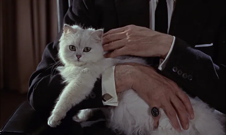 El punto de inflexión que grabó esta asociación en el imaginario colectivo fue, sin duda, la franquicia de James Bond. Ernst Stavro Blofeld, el líder de la organización SPECTRE, se convirtió en el referente definitivo al aparecer siempre acompañado de un gato blanco. Su debut fue en los años 60, donde solo veíamos sus manos acariciando al animaly se convirtió en un tropo tan potente que Mike Myers lo parodió detalle a detalle con el Doctor Malito y su gato, el Sr. Bigglesworth, en la saga de Austin Powers.