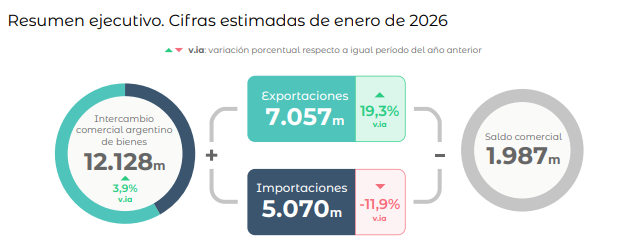 En enero de 2026, la balanza comercial argentina logró un superávit por USD 1.987 millones. Se trata del mejor saldo para un enero desde al menos 1990.