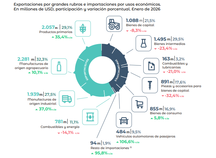 Ello fue gracias a que las exportaciones argentinas alcanzaron una cifra récord para un primer mes del año: USD 7.057 millones, una suba interanual del 19,3%. Respecto a diciembre, aumentaron también 11,4% en la serie desestacionalizada.
