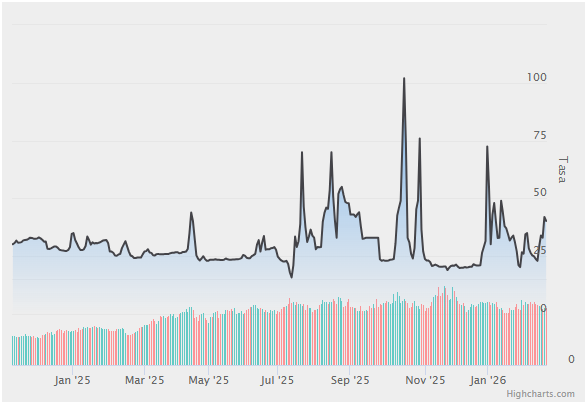 Por su parte, la tasa de caución a un día en pesos promedió el 40,24% anual, 4,37 puntos porcentuales por debajo del jueves, con un volumen de $3,4 billones.