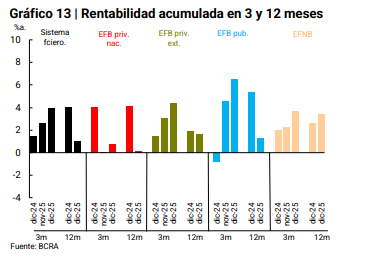 De este modo, el ROA del sistema financiero de 2025 “fue inferior al registrado en 2024, principalmente por un menor margen financiero integral real y por aumento de los cargos por incobrabilidad, efectos compensados parcialmente por una reducción en los gastos de administración, entre otros egresos”.