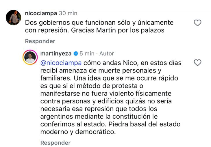 La publicación derivó en un intercambio con usuarios. Uno de ellos cuestionó al actual oficialismo y al gobierno anterior al señalar que “funcionan únicamente con represión”. Fue entonces cuando Yeza introdujo un elemento que modificó el eje del debate: aseguró que en los últimos días recibió amenazas de muerte contra él y su entorno familiar.