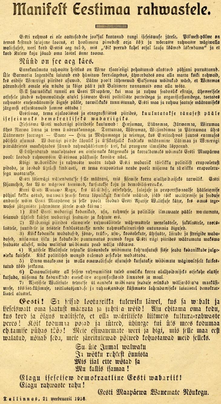 La revolución bolchevique y la retirada de Rusia de la guerra alteraron ese equilibrio. El vacío de autoridad permitió que líderes estonios organizaran un Consejo Nacional que preparó el terreno para una declaración formal. El 23 de febrero de 1918 se proclamó en la ciudad de Pärnu la creación de una república independiente. El anuncio fue difundido al día siguiente en Tallin, consolidando públicamente el nacimiento del nuevo Estado.