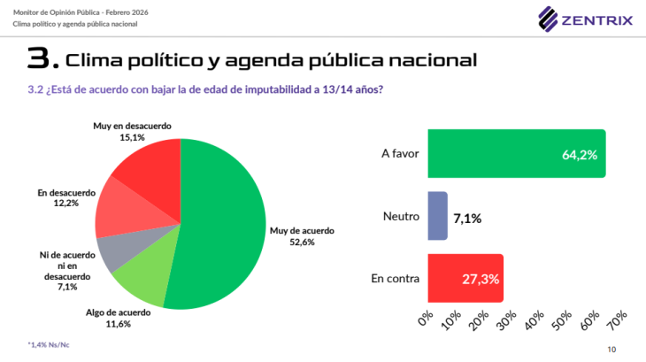 En contraste con la reforma laboral, la propuesta de reducir la edad de imputabilidad penal exhibe un nivel de apoyo más sólido. Según el informe, el 64,2% de los consultados se manifestó a favor, frente a un 27,3% en contra y un 7,1% que se ubicó en una posición neutral.