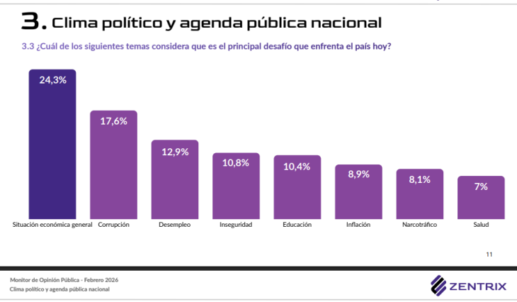 El monitor también indaga sobre los problemas que más inquietan a la población. En febrero, la situación económica en general aparece como la principal preocupación, con el 24,3% de las menciones, seguida por la corrupción (17,6%) y el desempleo (12,9%).