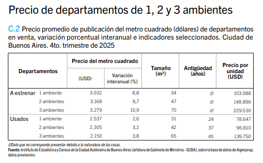 En el cuarto trimestre de 2025, el precio publicado por metro cuadrado para departamentos en venta en la Ciudad de Buenos Aires aumentó un 6,3% en dólares en comparación con el año anterior. Esta suba continúa una tendencia de ocho trimestres consecutivos de crecimiento en los valores.