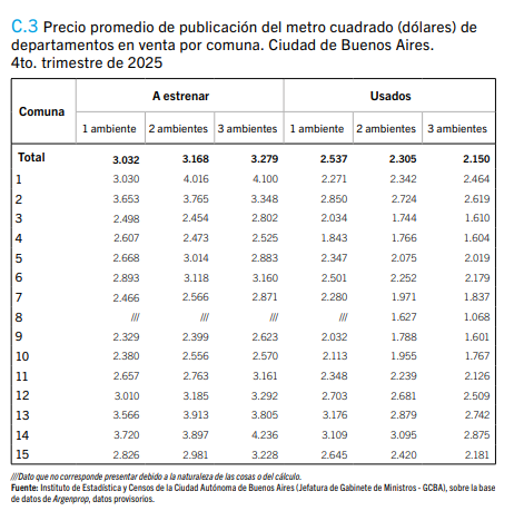 Según la ubicación, van desde los USD 2.329 el metro cuadrado en la Comuna 9 (Liniers, Mataderos, Parque Avellaneda) a USD 3.720 en la Comuna 14 (Palermo).