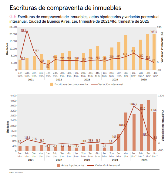 Las escrituras respaldadas por créditos hipotecarios también crecieron, totalizando 3.126 en el trimestre, aunque a un ritmo más moderado. Mientras los últimos trimestres, las subas interanuales alcanzaban los 3 dígitos, en el cuarto trimestre de 2025 crecieron sólo 3,4%.