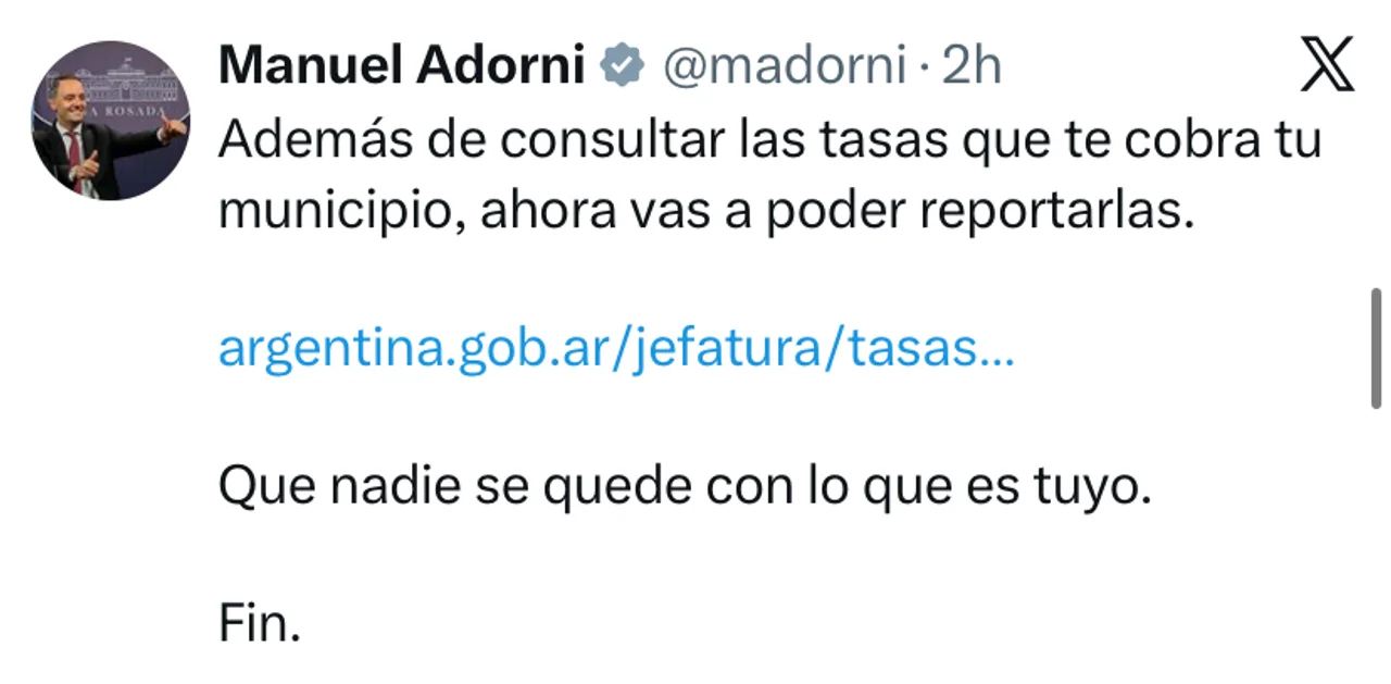 La medida fue comunicada por el jefe de Gabinete, Manuel Adorni, a través de redes sociales, donde lanzó un mensaje directo: “Que nadie se quede con lo que es tuyo”.