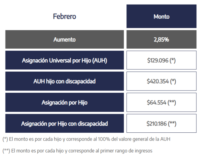 La AUH es en febrero de $129.096 para la zona general y de $167.825 para la zona 1, que comprende las provincias de La Pampa, Chubut, Neuquén, Río Negro, Santa Cruz, Tierra del Fuego, Antártida e Islas del Atlántico Sur, así como el partido de Patagones de la provincia de Buenos Aires.