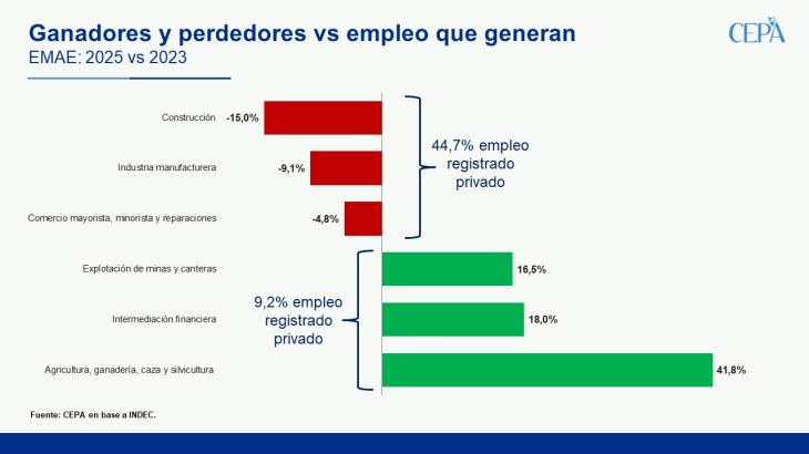Los sectores que crecieron con más fuerza explican apenas el 9,2% del empleo registrado privado. En cambio, los que mostraron caídas concentran casi la mitad del trabajo formal:
