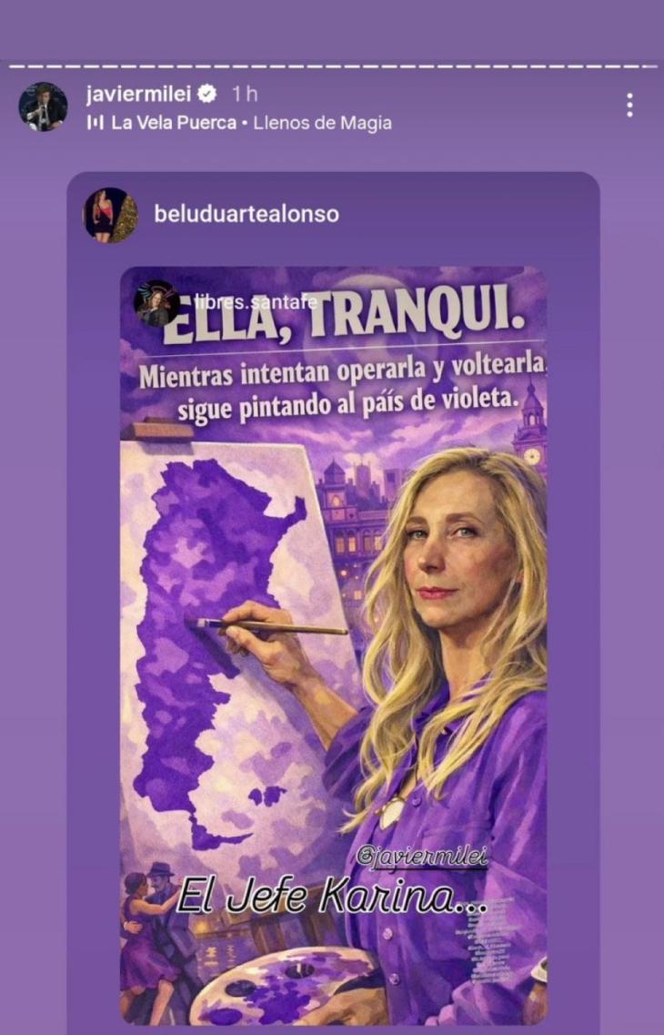 La publicación, que aludía a la frase “mientras intentan operarla y voltearla, sigue pintando el país de violeta”, fue compartida inicialmente por una cuenta afín al oficialismo en Instagram y luego replicada por el propio jefe de Estado. En el afiche se destaca la figura de Karina en actitud artística frente a una Argentina teñida del color asociado al partido gobernante, subrayando así su protagonismo político y mediático en el actual escenario político.