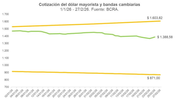 En promedio, en la rueda se operó a $1.388,58, según Comunicación “A”3500 del BCRA, a 15,5% del techo de la banda cambiaria, ubicado hoy en $1.603,82.