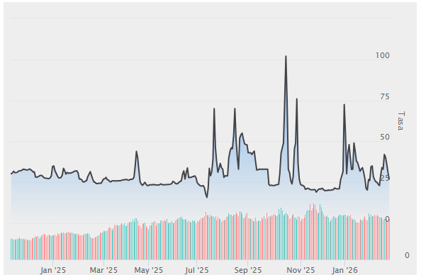 Por su parte, la tasa de caución a un día en pesos promedió 27% anual, encadenando la cuarta baja consecutiva, en este caso de 4 puntos porcentuales respecto de ayer.