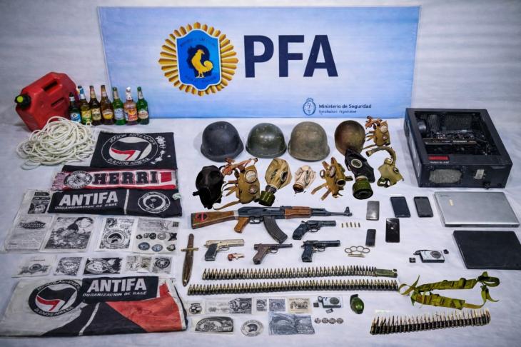 Durante el allanamiento también se incautaron banderas con consignas antifascistas, insignias del movimiento Antifa, banderas palestinas y pines con amenazas dirigidas contra el presidente Javier Milei y otros funcionarios nacionales.