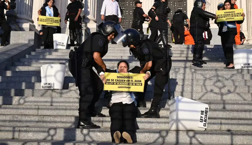 La antesala del debate por la reforma de la Ley de Glaciares en el Senado estuvo marcada por un fuerte clima de tensión en las inmediaciones del Congreso, donde una protesta ambiental encaebzada por un grupo de Greenpeace, derivó en un operativo policial que dejó personas detenidas y denuncias por agresiones.