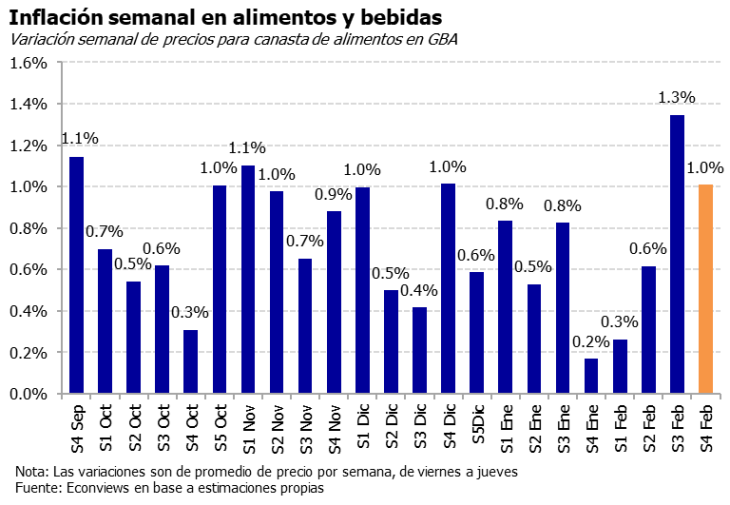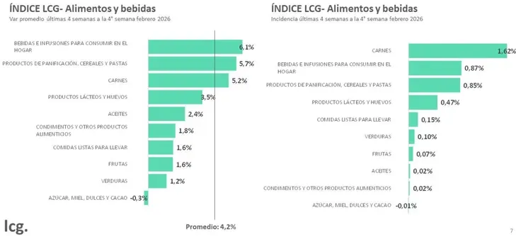 Por último, LCG registró una disparada de precios en los alimentos durante las cuatro semanas de febrero, con una suba superior al 4% (4,2%).