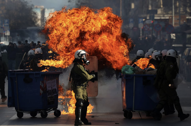 Fuerte despliegue policial en las calles de Atenas en el marco de las movilizaciones por el segundo aniversario del choque de trenes en Tempi.