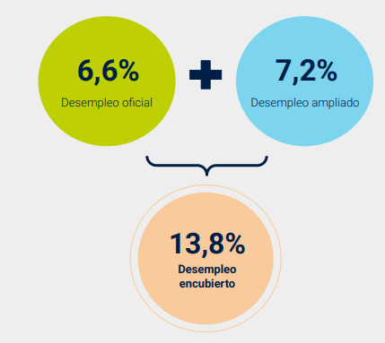 En 2024, trepó al 14,8% (6,9% de desempleo oficial y 7,9% de ampliado), y el año pasado se ubicó en 13,8% (6,6% de desempleo oficial y 7,2% de ampliado).