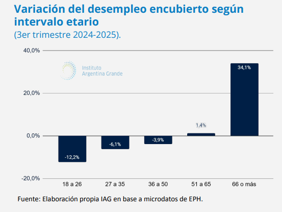 En cambio, en prácticamente todas las demás franjas etarias, el desempleo encubierto se redujo: -12,2% entre 18 y 26 años,-6,1% entre 27 y 35, y -3,9% entre 36 y 50 años. En la franja entre 51 a 65, se incrementó 1,4% interanual.
