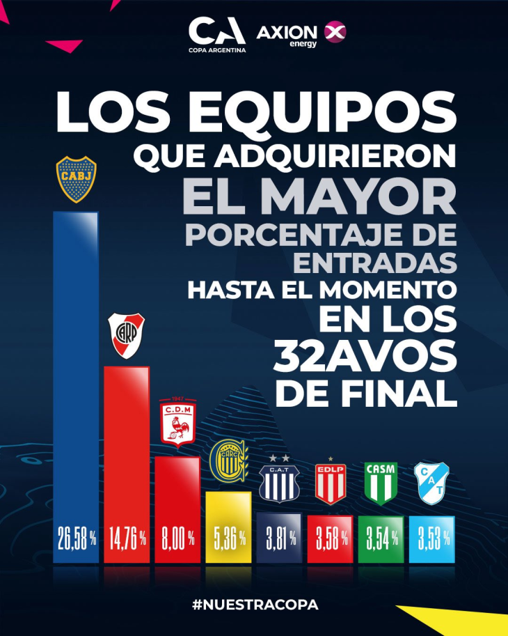 La Copa Argentina, patrocinada por Axion Energy, volvió a demostrar su magnetismo en las boleterías. Los números de venta de entradas en los 32avos de final reflejan la fuerza de los clubes más populares, pero también la capacidad de convocatoria de instituciones del ascenso que se ganan un lugar entre los protagonistas.