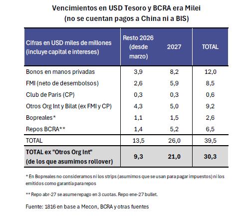 En 2027, los vencimientos ascienden a USD 26.000 millones, entre bonos en manos privadas (USD 8.200 millones), FMI (USD 5.900 millones), repos del BCRA (USD 5.200 millones) y otros.