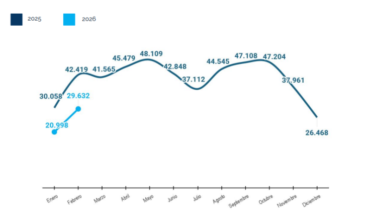 En el segundo mes del año, en el segmento automóviles y comerciales livianos, se produjeron 29.632 unidades. Esto es, 30,1% menos que en febrero de 2025. En el primer bimestre del año, se consolida una caída interanual de igual magnitud.