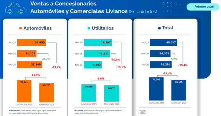 En cuanto a comercialización en la red de concesionarios, se vendieron 36.292 vehículos en febrero, 20,4% por debajo del volumen del mismo mes de 2025.