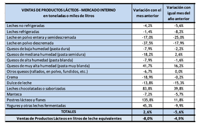 En los quesos, hubo comportamientos divergentes: aumentó la venta de quesos de muy alta humedad (+16,2%) y de mediana humedad (+2,6%) mientras cayó la de baja humedad (-2,2%) y de alta humedad (-1,6%).