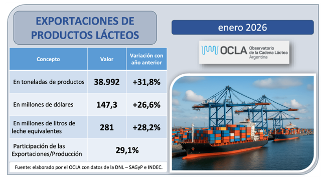 Las exportaciones de productos lácteos alcanzaron, en enero, las 38.992 toneladas, equivalente a USD 147,3 millones. Así, aumentaron 31,8% en cantidades respecto al mismo mes del año anterior. Medido en dólares, implica un aumento del 26,6% interanual.