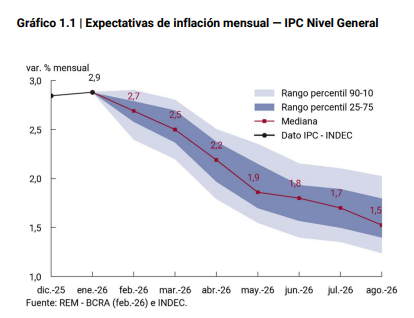 Las consultoras que releva mensualmente el Banco Central (REM) prevén para febrero un IPC del 2,7%, por debajo del dato de enero (2,9%).