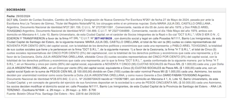 A su vez, la firma aparece vinculada a otras empresas relacionadas con el entorno de Toviggino y personas cercanas a su círculo.