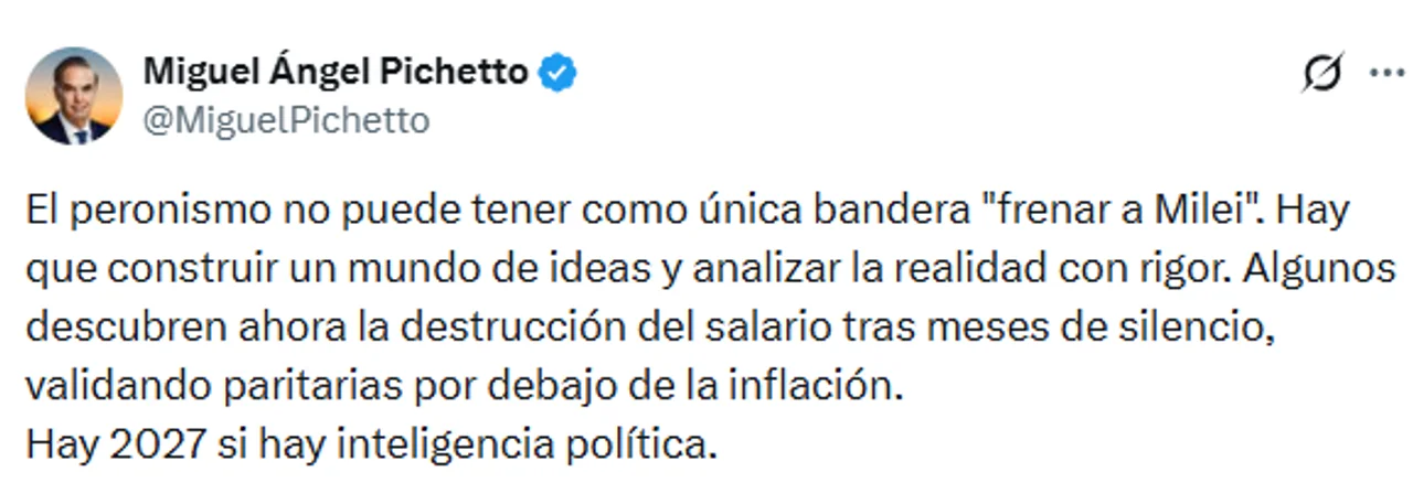 “El peronismo no puede tener como única bandera ‘frenar a Milei’. Hay que construir un mundo de ideas y analizar la realidad con rigor”, expresó el legislador a través de sus redes sociales.