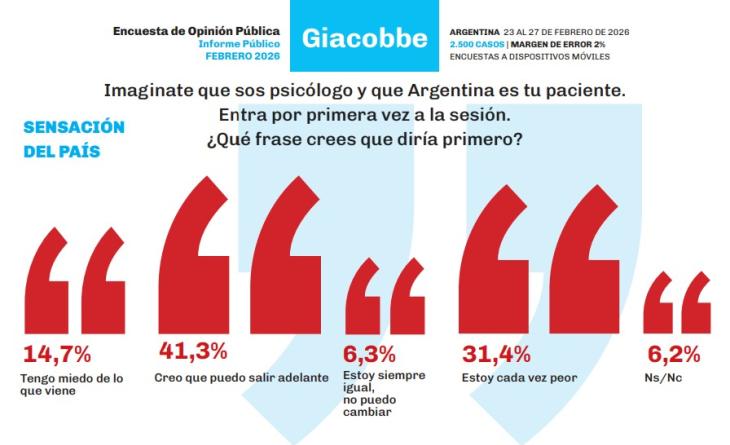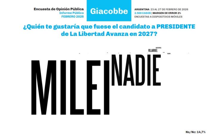 El último informe de la consultora Giacobbe, realizado entre el 23 y el 27 de febrero de 2026, muestra una caída en la aprobación de la figura presidencial, cuya imagen negativa alcanzó el 49,6%. El estudio se basó en un muestreo de 2.500 casos captados a través de dispositivos móviles en todo el territorio nacional.