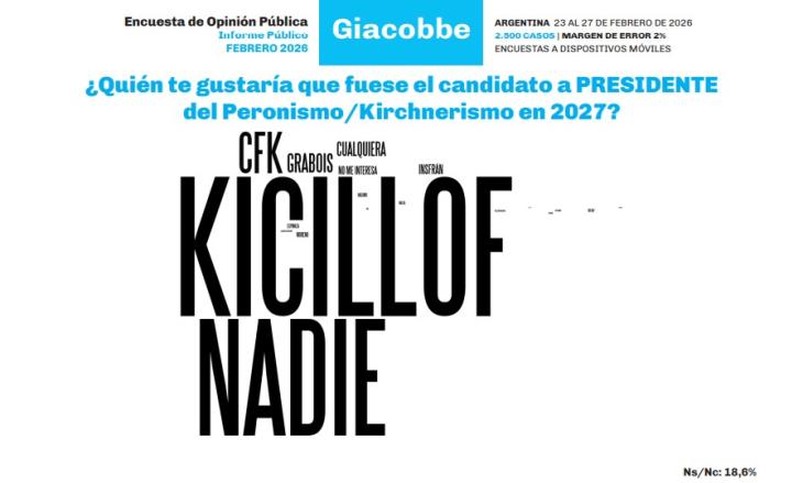 Por el lado del peronismo y el kirchnerismo, el gobernador bonaerense Axel Kicillof aparece como la figura central de recambio. En este sector, la opción "NADIE" también registra un tamaño preponderante, seguida por Cristina Kirchner, Juan Grabois y el gobernador formoseño Gildo Insfrán.