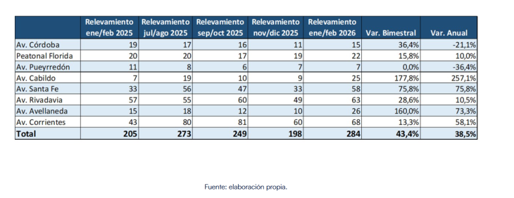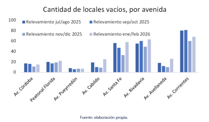 Según datos analizados por la CAC a partir de un relevamiento de la Federación de Mayoristas y Proveedores del Estado de la Provincia de Buenos Aires (FEMAPE), durante el bimestre enero-febrero de 2026 se registró un aumento del 180% en la cantidad de locales sin actividad en las principales áreas comerciales de la capital bonaerense.