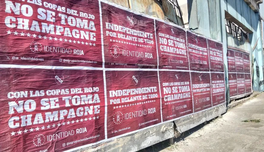 Los carteles, firmados por la agrupación opositora Identidad Roja, aparecieron en las inmediaciones del estadio y en varias zonas del centro de la ciudad con consignas como “Independiente por delante de todo” y “Con las copas del Rojo no se toma champagne”, una frase que apunta directamente contra lo que desde el espacio denominan el “grupo Champagne”, en referencia al actual oficialismo del club.