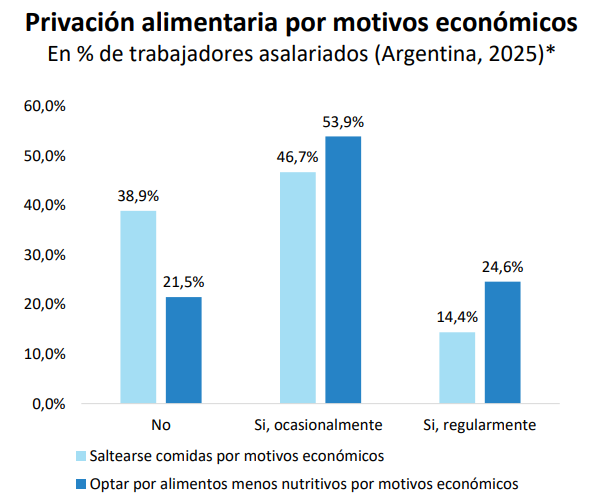 De este modo, más de la mitad de los trabajadores asalariados (56,2%) sufre la doble privación de saltarse alimentos y comer productos poco nutritivos, constituyéndose en el núcleo más crítico de la inseguridad alimentaria laboral.
