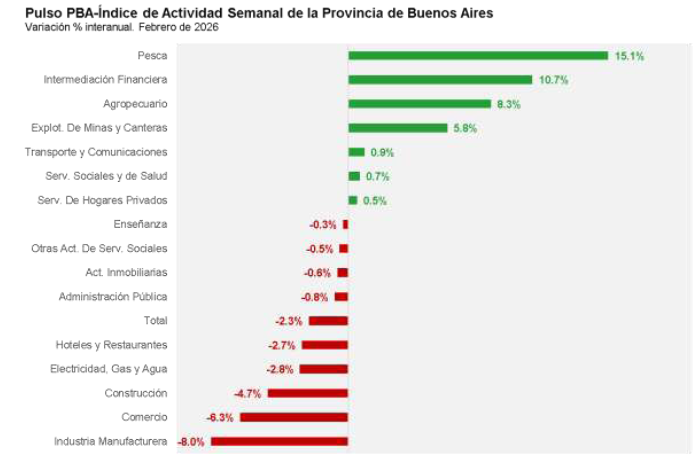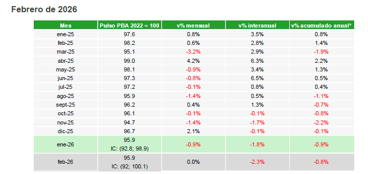 La actividad económica de la provincia de Buenos Aires volvió a mostrar señales de alarma en febrero, de acuerdo con el indicador Pulso PBA, elaborado por la Gerencia de Estudios Económicos del Banco Provincia.