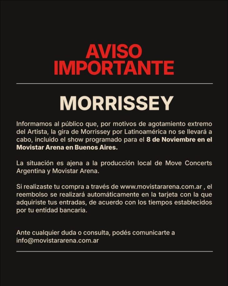 Según certeros informes, Morrissey canceló 38 fechas entre principios de 2025 y enero de 2026, donde nuestro país se vio afectado en más de una oportunidad y la última vez suspendió su gira por Latinoamérica debido a un supuesto "agotamiento extremo" que no le perimitió presentarse en vivo en el Movistar Arena.