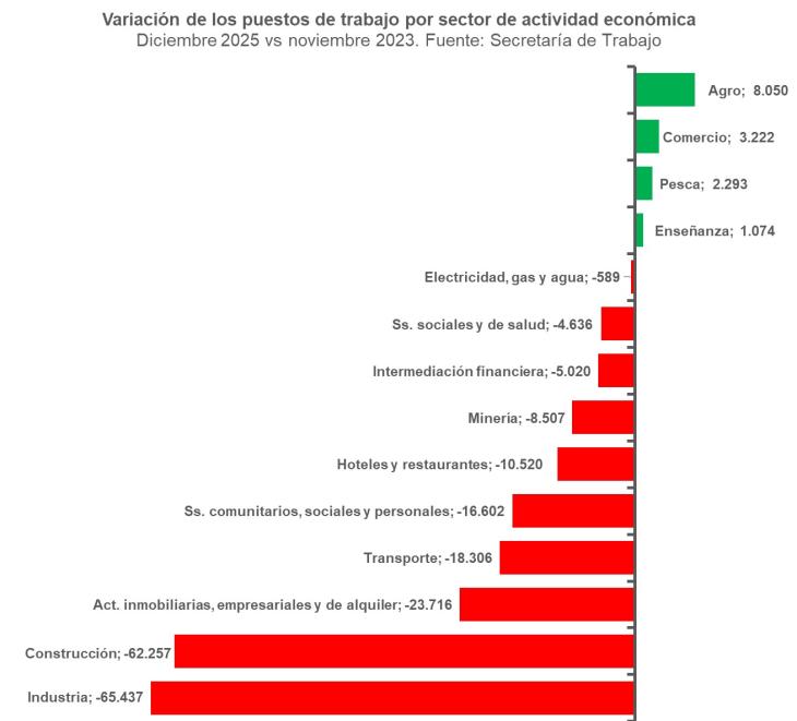 De los catorce rubros de actividad, sólo tres crearon empleo en diciembre: Construcción (+2.378), Enseñanza (+1.213) y Pesca (+237).