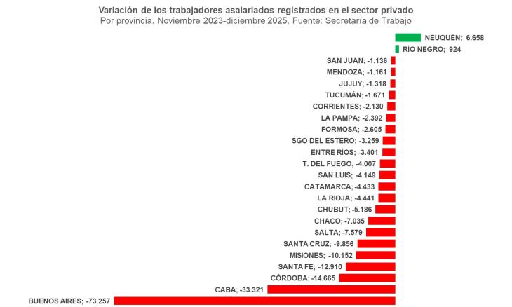 Desde la asunción de Milei, sólo 2 jurisdicciones lograron incrementar el empleo privado. En Neuquén se crearon 6.658 puestos, seguido de Río Negro (+924).