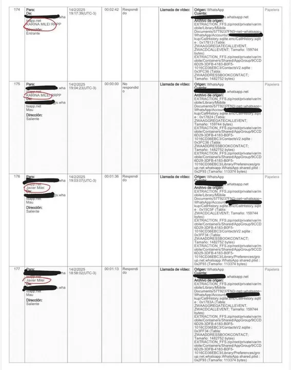 La secuencia continuó inmediatamente después del posteo. A las 19:03, Novelli volvió a comunicarse con el Presidente y hablaron nuevamente durante aproximadamente un minuto, lo que para los investigadores constituye un dato relevante para reconstruir el contexto en el que se difundió el activo digital.