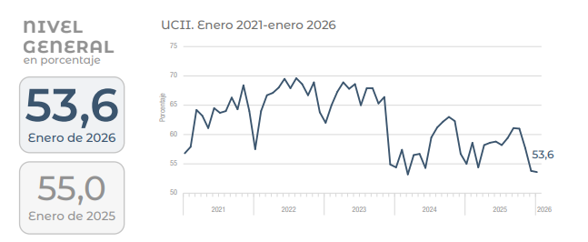 Ello no es de extrañar dada la baja utilización de la capacidad instalada de la industria. En enero de 2026, sólo el 53,6% de las máquinas estuvieron encendidas. Este porcentaje resulta menor al de enero de 2025 (55%), pero además, es el peor enero de la serie (desde 2016).