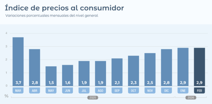 La inflación de febrero fue del 2,9% en Argentina, según informó el INDEC (Instituto Nacional de Estadística y Censos). Acumula así un IPC del 5,9% en el primer bimestre del año y un 33,1% interanual.