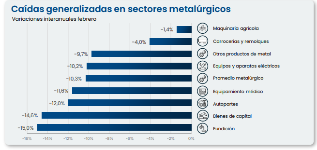 El retroceso se registró en todos los rubros del sector metalúrgico, aunque algunos segmentos fueron particularmente afectados.
