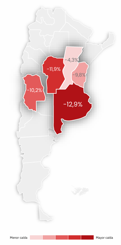Si se analiza la actividad metalúrgica por región, las caídas también son generalizadas. Las provincias más impactadas son: Buenos Aires, Córdoba, Mendoza, Entre Ríos, Santa Fe